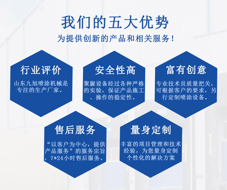 山東九旭機械科技有限公司是專業從事聚脲噴涂,聚脲噴涂設備,聚脲噴涂機,聚脲原料,聚脲防水涂料,聚脲設備產品配件的、生產、銷售和服務為一體的公司。歷經十余年的發展,已成長為聚氨酯設備行業頗具實力的設備制造業之一...